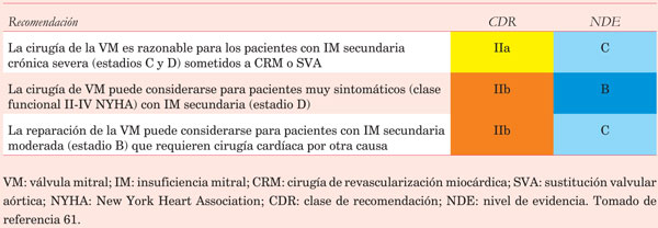 Se revisan los resultados de los diferentes registros respecto a la cirugía de remodelación ventricular en los pacientes con grandes cicatrices y áreas disquinéticas. Por último, se describe el papel de la cirugía en el tratamiento de la insuficiencia mitral secundaria a remodelación y disfunción ventricular, con un breve repaso sobre los criterios diagnósticos de la misma, los diferentes procedimientos ya sea de sustitución o reparación según la situación anátomo-funcional y sus ventajas y desventajas.