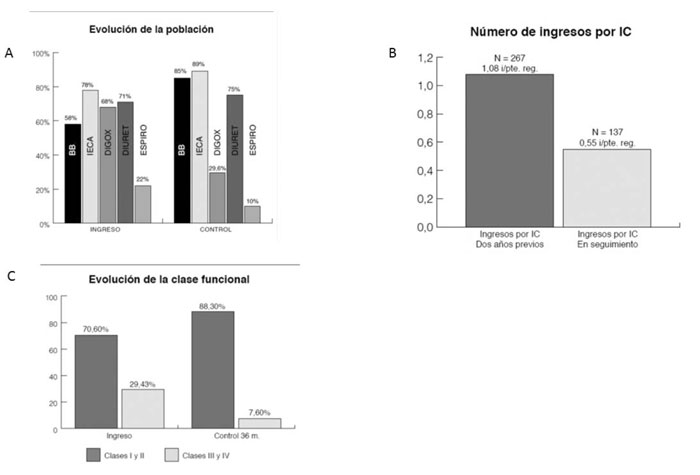 1. En los pacientes vinculados a un equipo multidisciplinario especializado la mortalidad se redujo 25%, los ingresos por IC 26% y los ingresos por cualquier causa 19%.