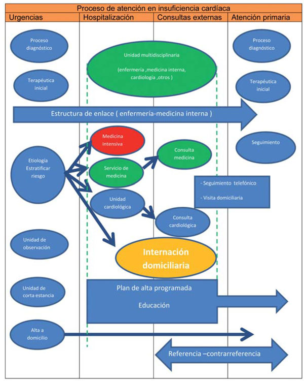 Es necesario un abordaje coordinado y multidisciplinario de la atención de los pacientes con IC, evitando el fraccionamiento de la misma.