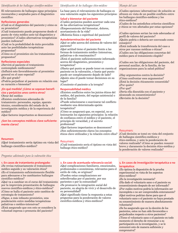 Existen múltiples tipos de procedimientos de decisión(1); destacamos el método presentado por el director del Centro de Bioética de la Universidad de Bochum (Alemania) y del Programa Europeo del Kennedy Institute de Washington, Hans Martin Saas, que ha sido publicado en 1987 y usado frecuentemente en Latinoamérica (tabla 1)(8).
