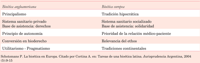 En los países europeos, de tradición humanista, el uso del método principalista se ha complementado con el resurgimiento del interés sobre las virtudes morales. Esto lo diferencia del primer modelo norteamericano, en el cual hay un neto predominio del principio de autonomía vinculado al marcado individualismo reinante en dicha sociedad. En Latinoamérica se acogió este modelo, imponiéndose como una novedad el auge de la autonomía y terminando con la implantación del consentimiento informado como una exigencia dentro de la relación sanitaria. Sin embargo, se observa que aunque se han tomado elementos provenientes de la influencia norteamericana, es fuerte aún la impronta humanística en nuestras regiones. Adela Cortina, refiriéndose a los posibles rasgos de una bioética latina, cita a Schtosmans, quien compara la bioética angloamericana con la europea. En el año 2001, Schtosmans presenta la síntesis de su estudio, que se ilustra en la tabla 2(9). Actualmente los mayores conflictos o dilemas éticos originados en las nuevas realidades sociales, económicas y culturales de nuestras sociedades están vinculados a la interpretación y al ejercicio del principio de justicia. En los países de escasos recursos económicos, con poblaciones vulnerables y con menor desarrollo de las tecnologías, la asignación de recursos sanitarios, los criterios de racionalización y la naturaleza de las obligaciones de los Estados, son temas que producen gran preocupación.