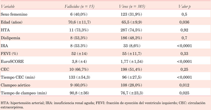 En el análisis univariado de la mortalidad quirúrgica los pacientes fallecidos eran significativamente más añosos y con EuroSCORE más elevado. La presencia de IRA, el uso de CEC y clampeo aórtico se asociaron a mortalidad. También se observó mayor duración de la CEC y del clampeo aórtico en los fallecidos (tabla 4).