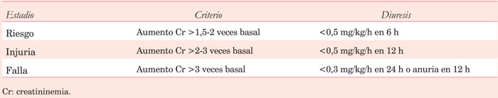 Utilizando la clasificación RIFLE se definió la IRA en tres estadios según el aumento de creatinina sérica: 1 - riesgo (aumento de creatinina >1,5 a 2 veces valor basal), 2 - injuria (aumento >2 a 3 veces valor basal) y 3 - falla (aumento >3 veces). En nuestro grupo, de los pacientes con IRA, 70,7% (29/41 pacientes) se presentó en estadio 1, 22,0% (9/41) en estadio 2 y 7,3% (3/41) en estadio 3.