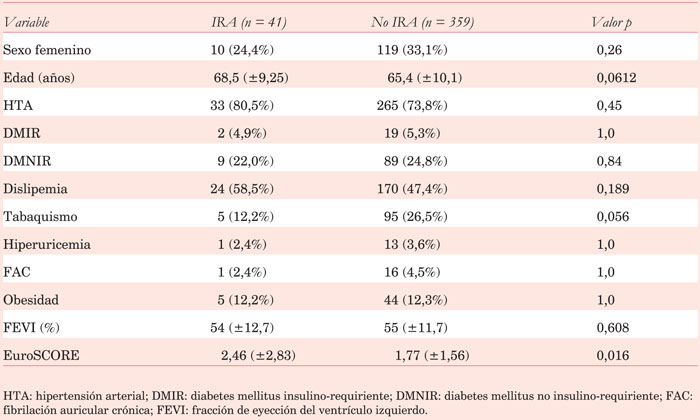 Como en la mayoría de los estudios existe franco predominio del sexo masculino. No se observaron diferencias significativas entre los grupos con respecto a la edad, FEVI y factores de riesgo cardiovascular. Sin embargo, el EuroSCORE es significativamente más alto en los individuos con IRA (tabla 2).
