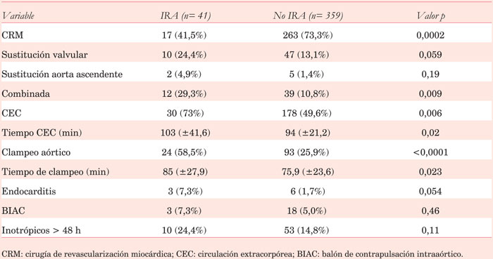 Cuando se consideran las variables perioperatorias en el análisis univariado se demuestra una asociación entre la presencia de IRA y la realización de cirugía combinada (sustitución valvular y CRM, doble sustitución valvular, sustitución de aorta ascendente y de válvula), el uso de CEC y clampeo aórtico. Los tiempos de CEC y clampeo aórtico son significativamente más prolongados en los pacientes con IRA. La CRM presentó una asociación inversa con IRA (tabla 3).