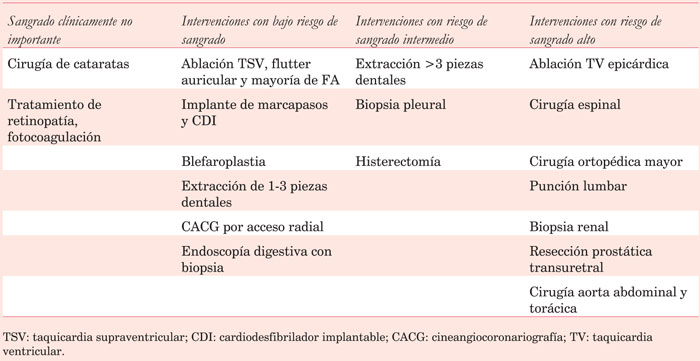 La clasificación propuesta por la ACC 2017, que se utilizará como referencia, realizada con el aporte de varias sociedades profesionales, estratifica los procedimientos más frecuentes en cuatro niveles de riesgo de sangrado: clínicamente no importante, bajo riesgo o riesgo intermedio/alto(1) (tabla 1).