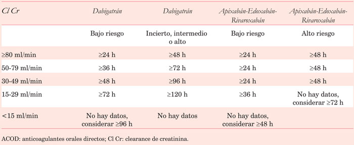 Salvo que la situación sea considerada de riesgo hemorrágico mínimo, en cuyo caso no se requiere la suspensión de ACOD (únicamente se omitirá la toma coincidente con el procedimiento), dicho tratamiento se suspenderá con una antelación que dependerá del riesgo hemorrágico del procedimiento y del tiempo necesario para que se produzca una pérdida del efecto anticoagulante (lo cual estará en relación, a su vez, con el aclaramiento de creatinina)(5).