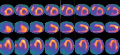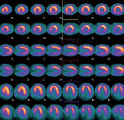 Estudio de perfusión miocárdica con 99mTc-sestamibi, estrés farmacológico con dipiridamol (línea superior) y reposo (línea inferior), el cual no evidencia zonas de hipoperfusión.