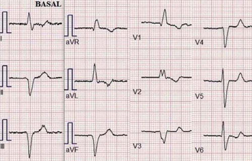 Electrocardiograma basal. Ritmo sinusal, P y PR normales. Bloqueo completo de rama derecha, hemibloqueo anterior izquierdo y alteraciones difusas de la repolarización, aunque sin evidencia de minivoltajes.