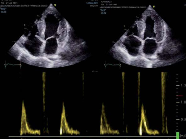 Ecocardiograma con enfoque apical de 4 cámaras en sístole (izquierda) y diástole (derecha) mostrando paredes engrosadas de manera concéntrica y simétrica, con aspecto de “vidrio esmerilado”. Patrón Doppler de tipo restrictivo (abajo), con llenado rápido y corto, onda e prominente y onda a de baja velocidad, ausencia de patada y desaceleración rápida.