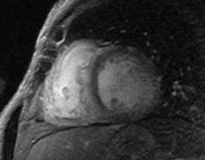 Paciente masculino de 75 años, sin antecedentes de cardiopatía, hipertenso, dislipidémico e hipotiroideo, con cuadro de disnea progresiva. En el ECG se observa ritmo sinusal de 63 cpm, P y PR normales, con bloqueo completo de rama derecha, hemibloqueo anterior izquierdo y alteraciones difusas de repolarización, sin minivoltajes (figura 1). El eco Doppler mostró severo engrosamiento del VI, hipocontractilidad global más marcada en pared anterior, fracción de eyección del ventrículo izquierdo (FEVI) de 30% y disfunción diastólica severa, configurando un patrón de miocardiopatía hipertrófica (figura 2). Con este resultado se realiza RM que informa, en secuencia de RT, imposibilidad de anulación del miocardio con diferentes tiempos de inversión, compatible con la presencia de amiloidosis. Presenta además RT del VD, con QALE score de 12 (figura 3). Dada la disnea aparentemente desproporcionada, se realiza centellograma de perfusión miocárdica con 99mTc-sestamibi con estrés farmacológico para descartar componente isquémico, que no demuestra alteraciones de la perfusión y FEVI <50% (figura 4).