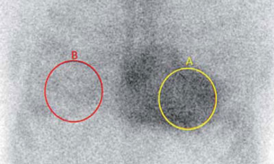 Método semicuantitativo sobre imagen planar en proyección anterior (cuentas en A=75.554, cuentas en B=41.134, relación H/CL=1,84).