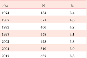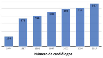 La evolución de los especialistas en cardiología en los últimos 44 años ha oscilado entre 3,4% y 4,6% del total de médicos habilitados para ejercer la profesión (figura 1), (tabla 1).