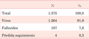 Porcentajes de pacientes vivos y fallecidos en el período de seguimiento.