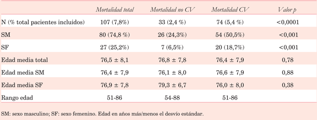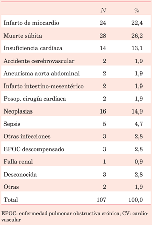 Las muertes de causa CV fueron 74 (5,4% del total de pacientes) y el resto (no CV) fueron 33 (2,4%), p<0,0001. En las CV predominaron: la muerte súbita en 28 (26,2%), el infarto de miocardio en 24 (22,4%) y la insuficiencia cardíaca en 14 (13,1%).