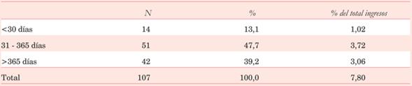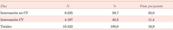 El total de días de reinternación de todos los pacientes fue de 10.422. El período fue menor para los reingresos por causa CV (40,3%) que por todas las causas (59,7%), p<0,001 (tabla 8).