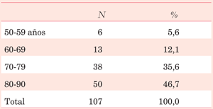 El promedio de edad fue de 70,5 ± 9,6 años (SF: 73,2 ± 9,1 años; SM: 69,4 ± 9,6 años, p<0,001).