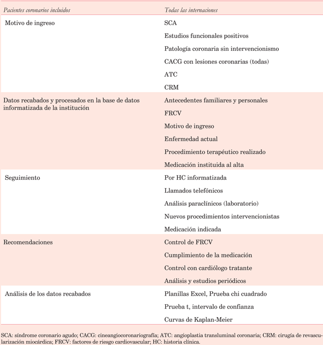 Los pacientes, una vez ingresados, pasaron a pertenecer a un programa de prevención cardiovascular (PPC) conformado por una base de datos que va siendo completada por un cardiólogo. La misma registra información acerca de filiación, antecedentes familiares y personales, factores de riesgo, motivo del ingreso hospitalario, enfermedad actual, diagnóstico, estudios funcionales y de laboratorio, tratamiento inicial y medicación al alta. Se los participó de una charla informativa sobre su enfermedad al alta, de forma voluntaria, para luego ser llamados en forma telefónica y periódica (aproximadamente cada seis meses) por un cardiólogo, explorando los controles médicos realizados, exámenes de laboratorio, medicación instituida y cumplida. En este seguimiento se realizaron recomendaciones sobre cambios de estilo de vida, cumplimiento del tratamiento medicamentoso y control con cardiólogo tratante. Se determinaron los factores predictores de morbilidad, las causas de reinternaciones y de óbito. Se revisó la historia clínica informatizada de la institución y se crearon dos nuevas planillas de datos: reinternaciones y egresos.