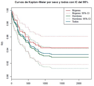 Finalmente se muestran las curvas de Kaplan-Meier de sobrevida de los pacientes totales y por sexo (figuras 1, 2 y 3), donde se observa claramente un período de mayor mortalidad en los primeros años para ir estabilizándose con el paso del tiempo.