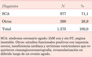 Dentro de las causas CV, la enfermedad coronaria isquémica se presentó como SCA en 175 pacientes (39,1%), correspondiendo a angina inestable en 141 pacientes (31,5%) y a infarto agudo de miocardio (IAM) (con y sin ST) en 34 (7,6%). El resto correspondió a una miscelánea compuesta de complemento de revascularizaciones en diferido (ATC o CRM), pacientes sintomáticos internados pero no pasibles de nueva terapia intervencionista (angina estable, falla cardíaca), implantes de marcapasos y arritmias cardíacas.