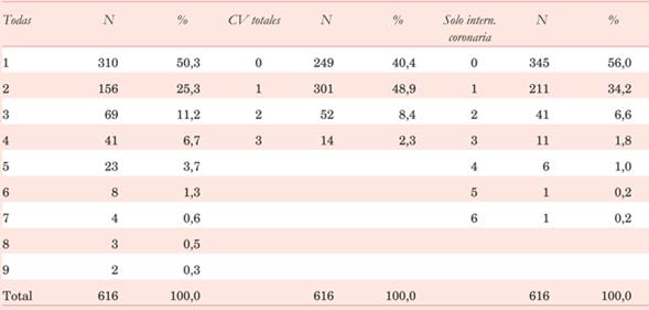 De los 616 pacientes con reingresos, 367 (28,2% del total) reingresaron por alguna causa CV y entre estos, 271 (20,8%) pacientes reingresaron por enfermedad coronaria isquémica exclusiva. Expresado de otra forma, 1.030 pacientes estuvieron libres de nuevos eventos coronarios obstructivos (79,2% del total de ingresos al programa disponibles para el seguimiento).