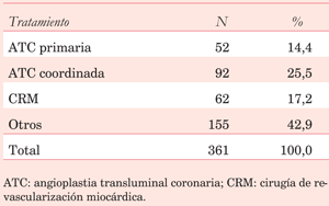 Referente a los tratamientos instituidos en los pacientes con patología coronaria obstructiva predominó la opción de una nueva revascularización mediante ATC en 144 (39,9%) en comparación con CRM en 62 casos (17,2%) (p<0,001). El valor de p comparando grupo intervencionista (ATC + bypass coronario) con 206 pacientes (57,1%) versus tratamiento médico no intervencionista con 155 pacientes (42,9%) fue de 0,02 (tabla 6).