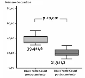 Eficacia del tratamiento del NR: TIMI Frame Count pre y postratamiento.