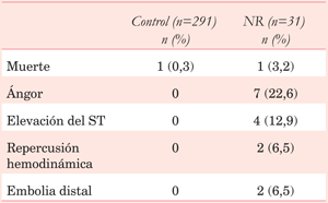 Las complicaciones del NR intraprocedimiento e intrahospitalarias son bien conocidas e incluyen persistencia de la sobreelevación del ST, arritmias y aumento de la mortalidad de hasta tres veces para mortalidad intrahospitalaria(41-45). También se ha asociado el NR a mayor incidencia de accidente cerebrovascular(45,46) y de embolia distal del vaso a tratar(47). En nuestra serie no comprobamos diferencias significativas en la incidencia de eventos cardiovasculares adversos intrahospitalarios entre grupos, probablemente por el tamaño reducido de la muestra.