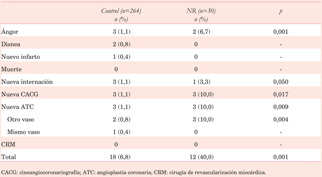 Se realizó un seguimiento a tres meses a un total de 294 pacientes (91,3%); en el 8,7% restante no fue posible contactar a los pacientes. Respecto a los eventos, la incidencia de ángor, nueva internación, nueva CACG y nueva ATC del mismo vaso fue mayor en el grupo NR, con diferencia significativa respecto al grupo control. La incidencia total de eventos fue mayor en el grupo NR que en el grupo control (control 18 [6,8%] vs 12 [40%], p=0,001) (tabla 10).