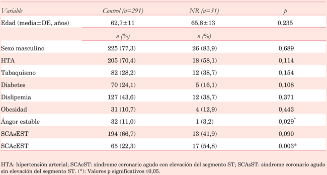 Este estudio incluyó un total de 322 pacientes consecutivos sometidos a ATC por cualquier indicación entre octubre de 2016 y enero de 2017 en el Servicio de Cardiología Intervencionista del Centro Cardiológico Americano. Los grupos predefinidos, control y NR, constaron de 291 y 31 pacientes respectivamente.