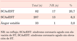 Con respecto a la incidencia de NR, según las diferentes presentaciones clínicas que motivaron la ATC, fue máxima en el SCAcST, ocurriendo en el 20,7% de los casos, seguida por el SCAsST y la angina estable (tabla 2).