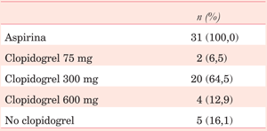 Se registró el tratamiento antiagregante previo a la ATC en el grupo de NR; la dosis carga de clopidogrel fue de 600 mg en el 12,9% de los casos y de 300 mg en el 64,5% (tabla 3).