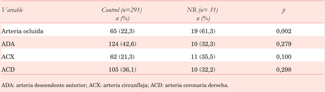 En lo que respecta al vaso culpable, se ha descrito que la arteria descendente anterior es un predictor de NR(21). Sin embargo, en nuestro estudio no logramos demostrar una asociación significativa entre arteria culpable y NR, probablemente por el bajo número de casos incluidos.