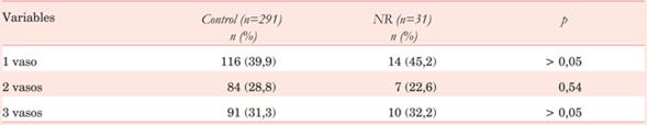 En lo que respecta a la severidad de la enfermedad coronaria, evaluada en base al número de vasos afectados, no se comprobó diferencia significativa en la comparación entre grupos. En ambos grupos se observó un predominio de la lesión de 1 vaso (control: 39,9% vs NR: 45,2%), seguido de lesión de 3 vasos (control: 31,3% vs NR: 32,2%) y de lesión de 2 vasos (control: 28,8% vs NR: 22,6%) (tabla 5).