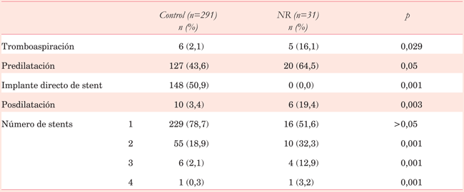 La frecuencia de utilización de tromboaspiración, predilatación y posdilatación fue mayor en el grupo NR, con diferencia estadísticamente significativa con respecto al grupo control (tabla 6).