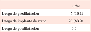 La posdilatación del stent fue más frecuente en el grupo NR, esto podría explicarse porque al lograr una mejor aposición del stent, la posdilatación podría provocar microembolización distal del material aterotrombótico remanente ubicado entre la malla metálica y la pared arterial. Sin embargo, no comprobamos ningún caso de NR que se presentara luego de la posdilatación, lo que pone en duda el mecanismo propuesto.