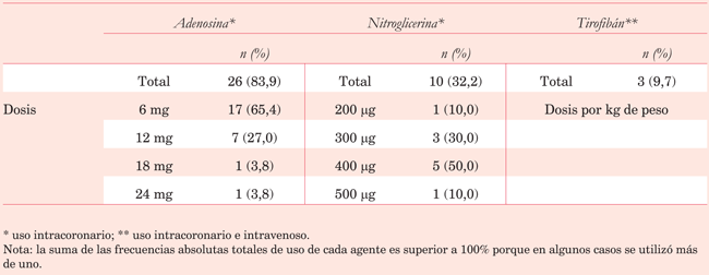 El tratamiento farmacológico más frecuentemente utilizado para el NR fue la adenosina intracoronaria. Las dosis utilizadas de nitroglicerina (NTG) y adenosina corresponden a un amplio rango, con predominio de dosis elevadas, siendo las más frecuentes: NTG 400 µg y adenosina 6 mg por vía intracoronaria (tabla 8).