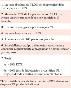 La Sociedad Europea de Arritmias (EHRA) ha establecido diversos criterios de calidad de una unidad de síncope, que se resumen en la tabla 7. A pesar de las recomendaciones, desarrollar una unidad de síncope no es fácil, las barreras para establecerla incluyen falta de recursos y de personal capacitado. Por estos motivos no se han generalizado en la práctica.
