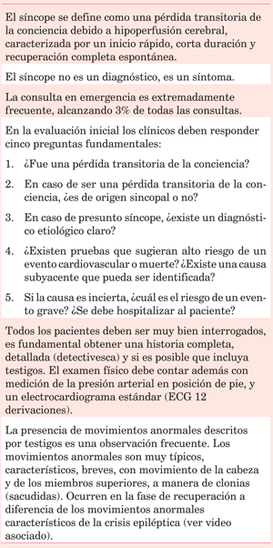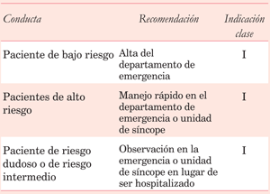El médico en la emergencia debe tratar de establecer el diagnóstico, única forma de definir una conducta y una terapéutica adecuadas. El 50% de las pérdidas de conocimiento tienen una causa obvia. En el otro 50% se sugiere utilizar un algoritmo donde se categoriza al paciente en bajo y alto riesgo. Los pacientes de bajo riesgo pueden ser dados de alta y se les debe entregar un instructivo con recomendaciones para prevenir nuevos episodios sincopales.