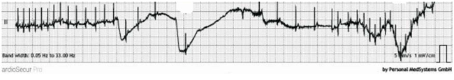 Síncope reflejo vasovagal con componente cardioinhibitorio. Electrocardiograma mostrando la derivación DII a 5 mm/s durante una prueba de inclinación de un paciente de 16 años, con historia de episodios sincopales luego de dolor intenso, el último postraumatismo de rodilla derecha. Se puede observar cómo la frecuencia cardíaca se va enlenteciendo progresivamente hasta que desarrolla asistolia por casi 9 s. Luego de la misma, el paciente se recupera completamente.