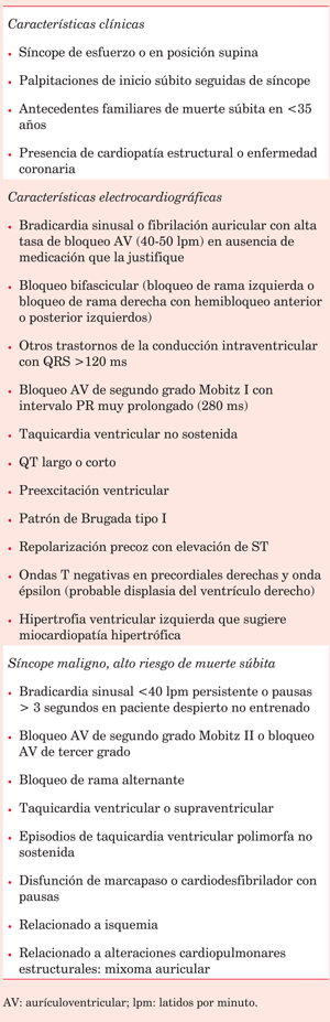 Características clínicas y electrocardiográficas que sugieren síncope cardíaco o potencialmente maligno.