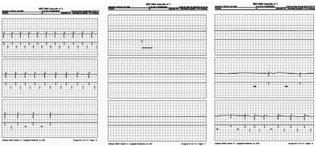 Registro de eventos implantable del caso número 2. Es un trazado continuo. Se observa cómo desarrolla una asistolia de 36 segundos. Luego de alguna pausa secundaria, se recupera completamente.