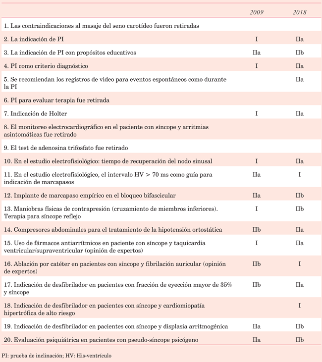 En la tabla 6 se resumen las principales diferencias entre las guías de síncope 2009 y 2018.