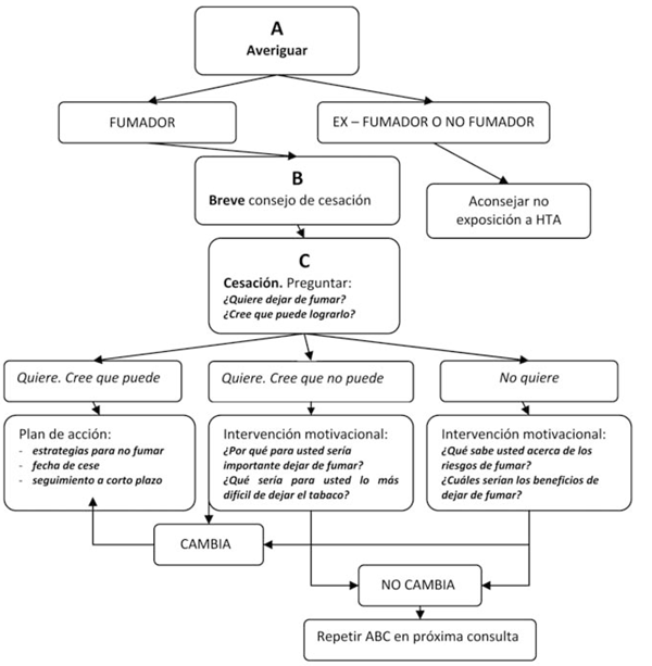 Lo primero es Averiguar (A) el vínculo de la persona con el tabaco, inmediatamente dar un consejo Breve (B) de cesación y luego ofrecer ayuda para lograr la Cesación (C) del consumo. La Guía Nacional de Abordaje del Tabaquismo de nuestro país llama a esta intervención el ABC de la cesación(16).
