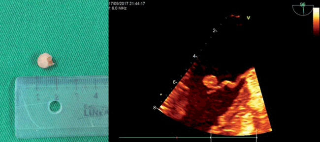 A izquierda: pieza quirúrgica extirpada de 7 mm de longitud, con pequeño pedículo. A derecha: ecocardiograma transesofágico, se observa masa redondeada adherida a la superficie auricular de la valva anterior mitral. Nótese la presencia de microcalcificación central y ecogenicidad inhomogénea.