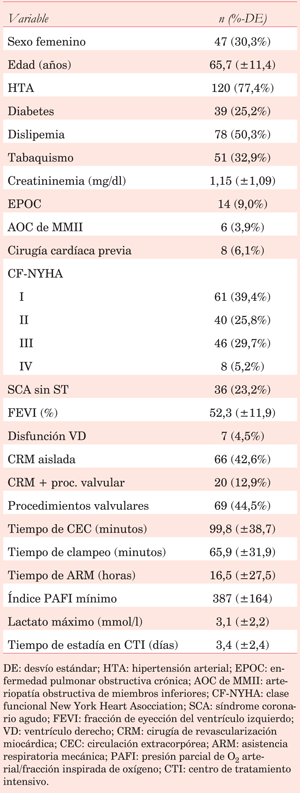 Se incluyó un total de 155 pacientes, con edad de 65,7 ±11,4 años; 108 de sexo masculino (69,7%). La indicación más frecuente de CC fue la coronariopatía aislada (66 pacientes, 42,6%), y dentro de la patología valvular, la estenosis aórtica (48 pacientes, 31,0%) (tabla 1). La mediana y rango de NT-ProBNP preoperatorios en la población global fueron de 443 pg/ml (143- 1.193), de 369 pg/ml (99-948) en los pacientes coronarios y de 415 pg/ml (128-1.179) en los pacientes valvulares.