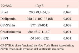 De la regresión lineal multivariada, las variables que fueron estadísticamente significativas como predictores de NT-proBNP preoperatorio fueron: edad (p=0,026), dislipemia (p=0,002), CFNYHA (p=0,008), creatininemia (p=0,001) y FEVI (p=0,001) (tabla 3). Se destaca una relación negativa entre la dislipemia y el valor de NT-proBNP.