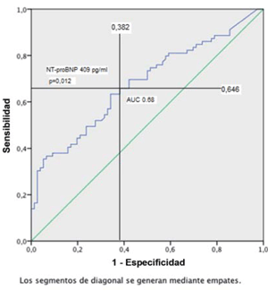 De las variables estudiadas como predictores independientes de estadía prolongada en CTI, la única que resultó significativa fue el valor de NT-proBNP preoperatorio (OR=1,61; IC95% 1,11- 2,35, p=0,012). El análisis de la curva ROC mostró que el punto de corte de NT-proBNP que mejor predijo internación prolongada en CTI fue de 409 pg/ml (AUC 0,68), con una sensibilidad de 65% y una especificidad de 62% (figura 1).