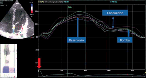 El estudio de la función auricular izquierda es complejo y multiparamétrico(26,27); las guías de cuantificación de la función y tamaño de las cavidades cardíacas contemplan el uso de medidas bidimensionales y volumétricas para tal cometido. El strain auricular izquierdo reservorio (SAIR) es un método de reciente desarrollo en la última década, que permite evaluar la función auricular izquierda y su relación con la función ventricular izquierda.