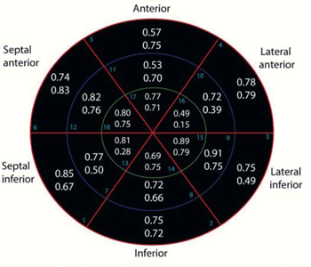 Figura 2: “Ojo de buey” auricular, representando la reproducibilidad de cada sector de las paredes de la aurícula izquierda por el CCI. El valor de CC superior corresponde a la reproducibilidad intraobservador y el inferior a la reproducibilidad interobservador.